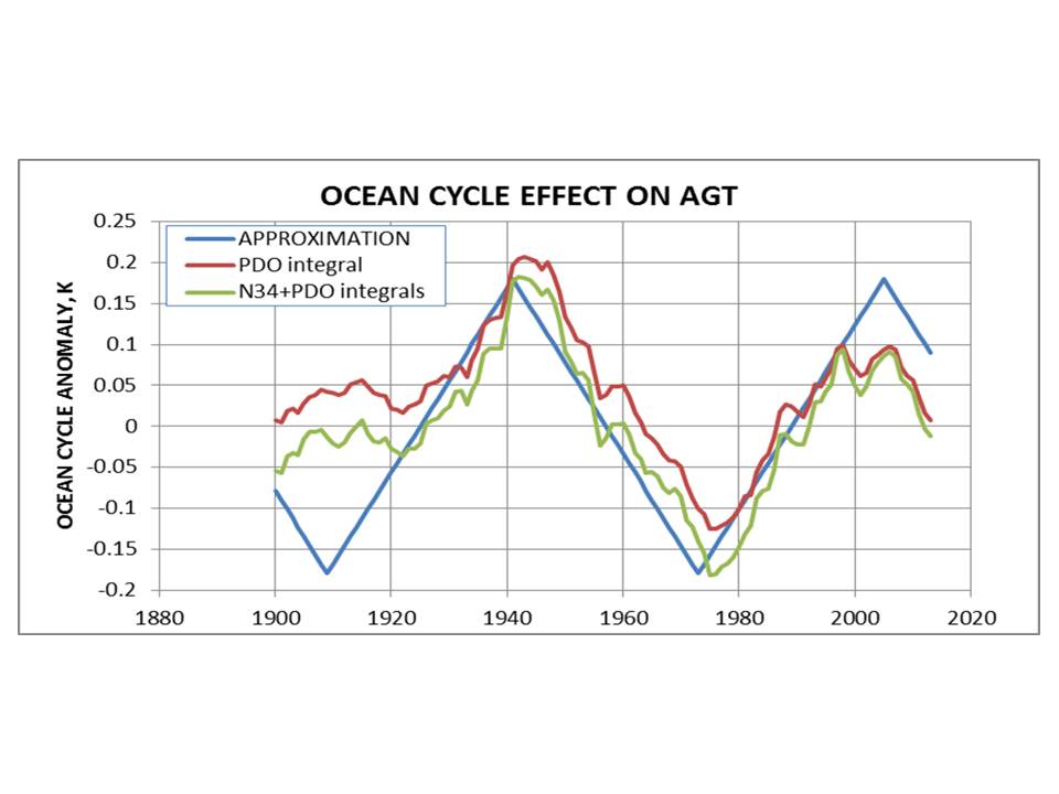 by derived attribution of ocean cycles to the average global temperature trajectory,